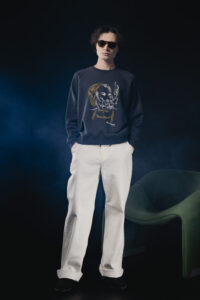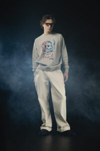 繊細なピンストライプアートで表現したラグランスリーブスウェット。